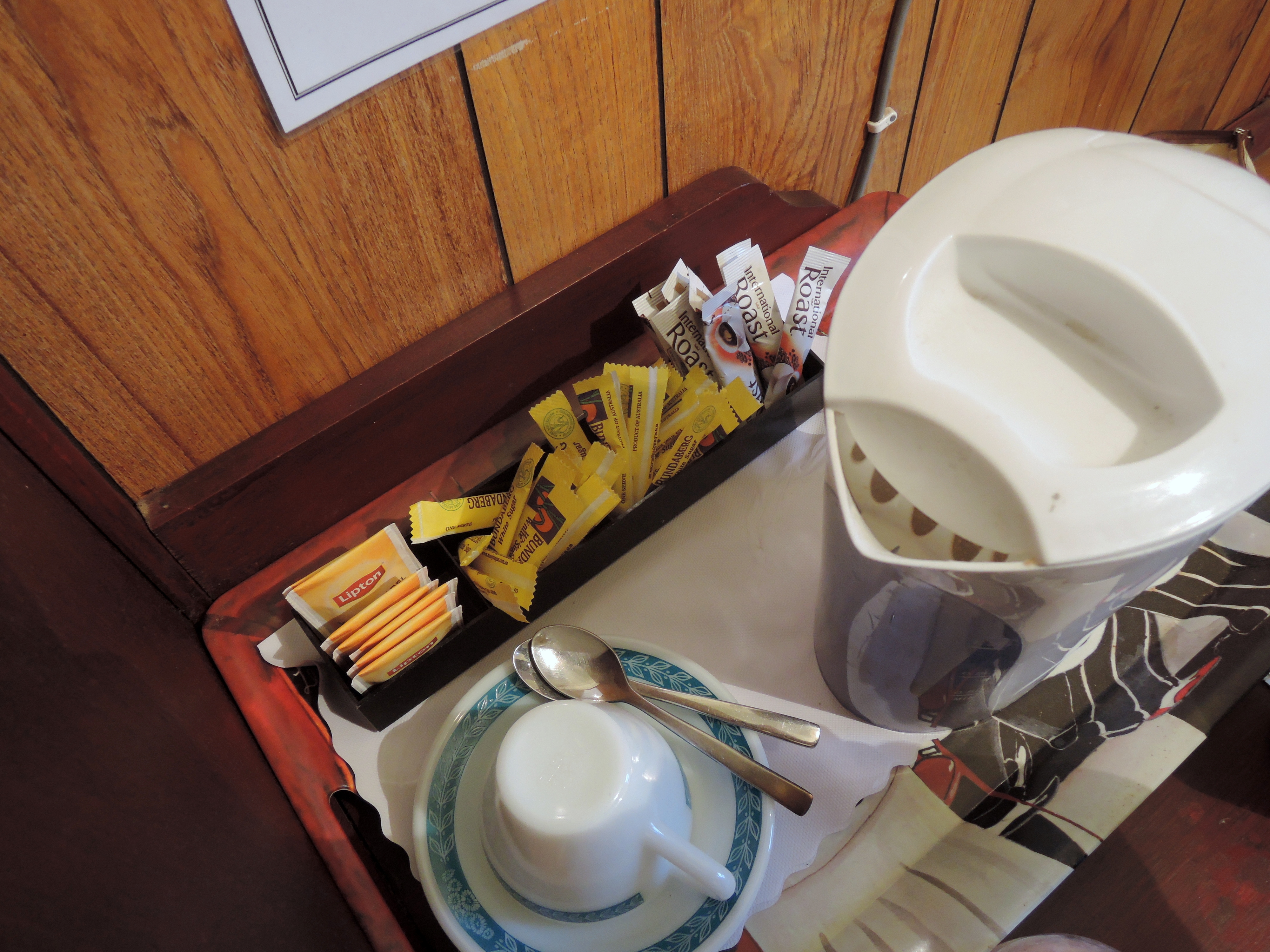 ボロホテルだが、電気ケトルとインスタントコーヒーと紅茶のティーバッグがたくさん置いてあるのはありがたい。