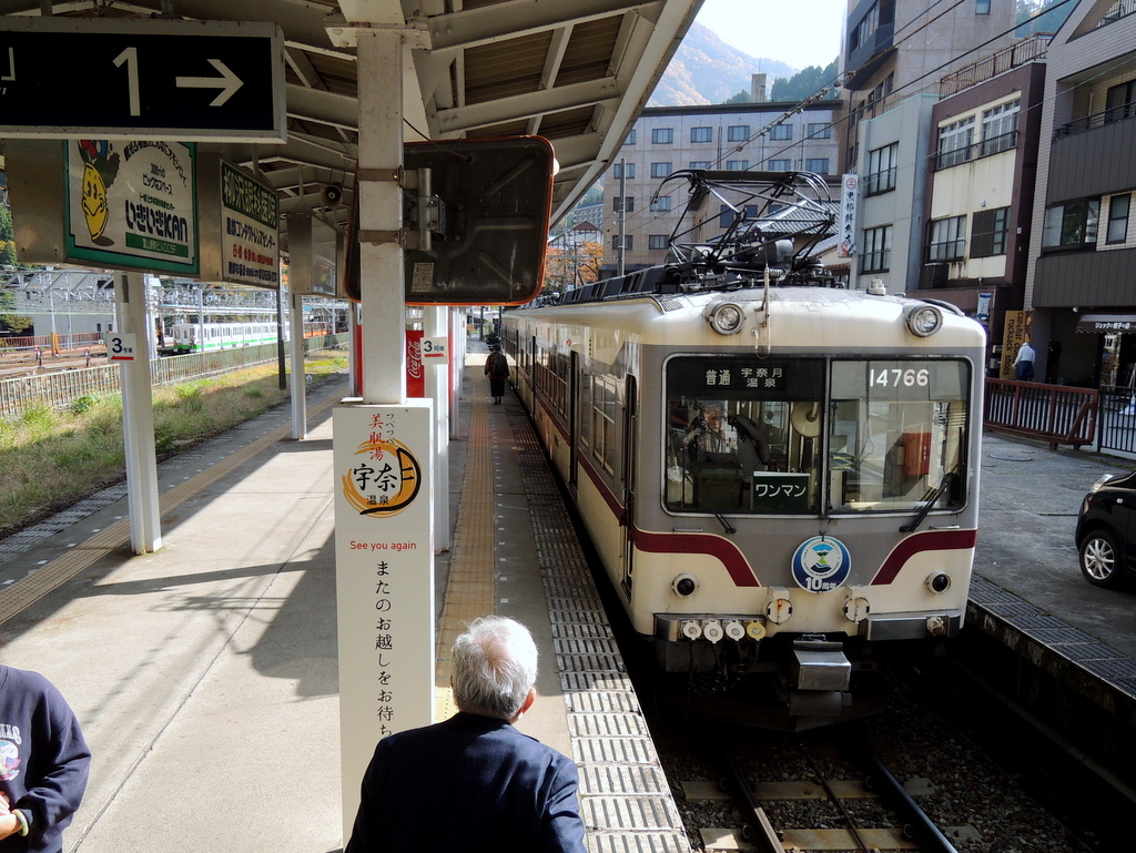 新黒部駅で下車する宇奈月温泉からの観光客。