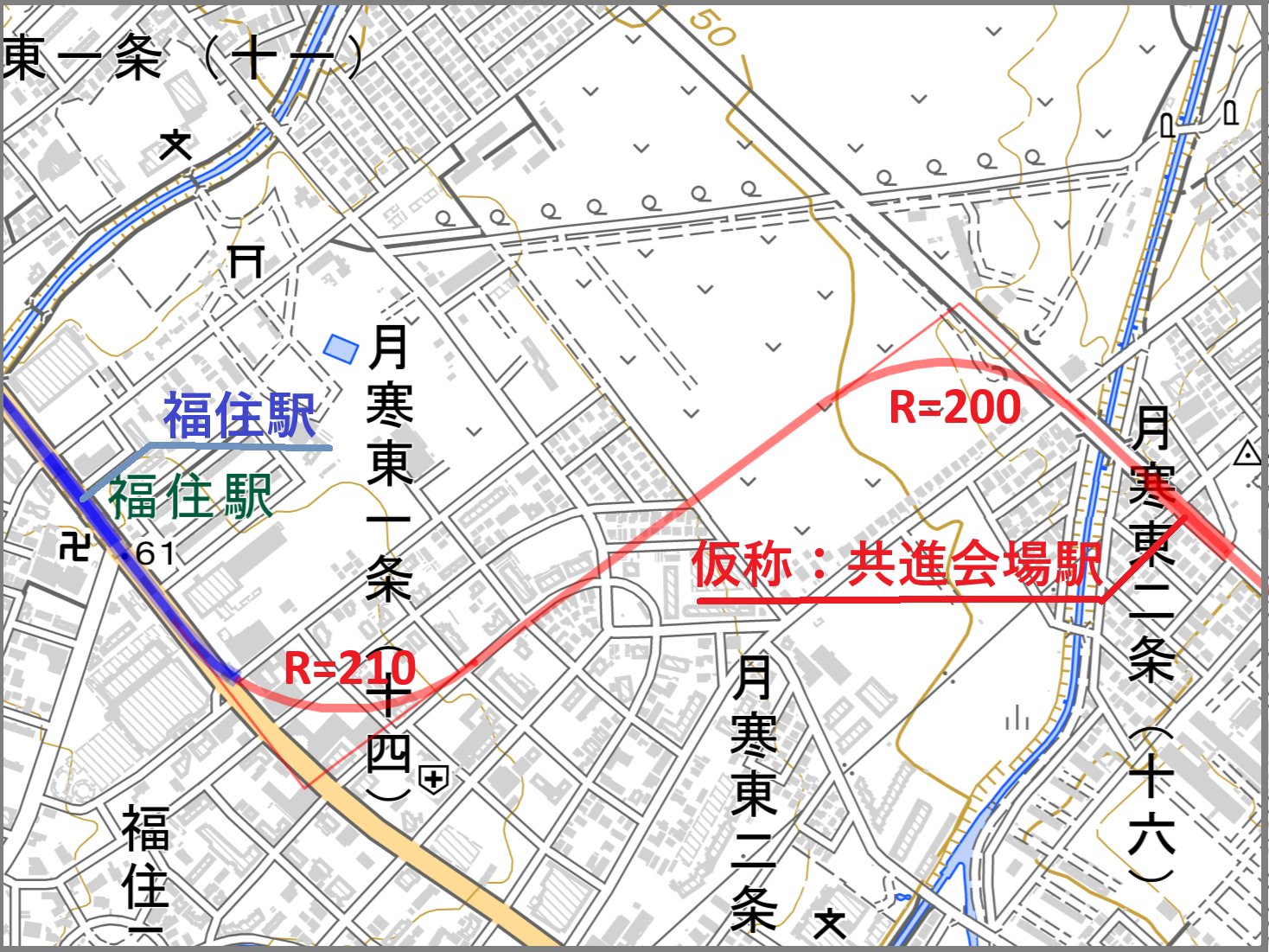 東豊線終点からさらに半径210mで延長してみる(地理院地図より筆者作成)。