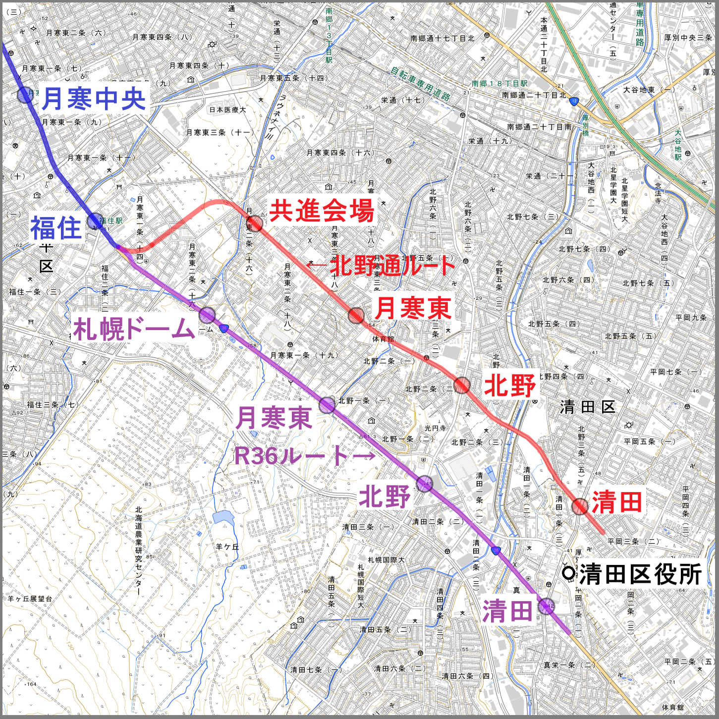 福住〜清田間のルートはこうなった(地理院地図より筆者作成)