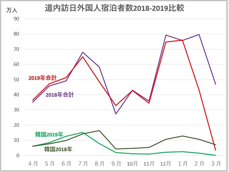 前年の2018年度データと比較すると、韓国からの観光客数は各月に渡り、最大で10万人以上もの減少となってしまいました。