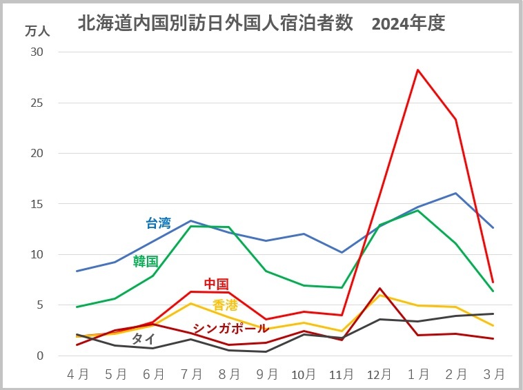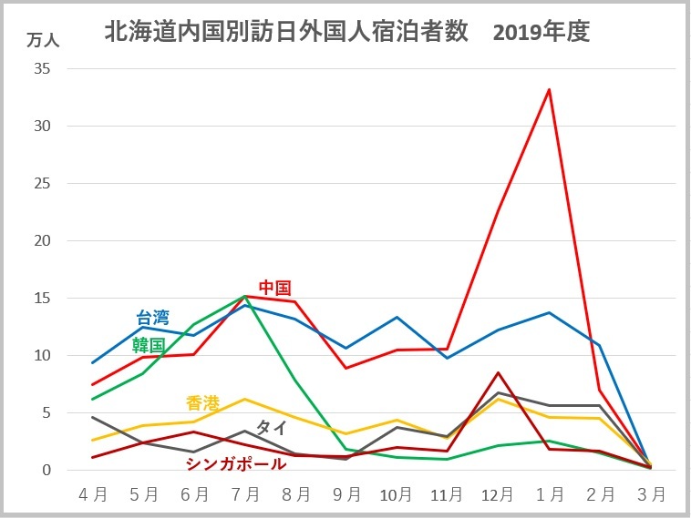 宿泊者数=来道観光客とは限りませんが、外国から来る以上はどこかに宿泊するわけで、これを実態数としてもさほど違いは無いものと思われます。